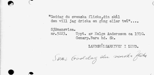 //// "Goddag du svenska flicka,din skål //// den vill jag dricka en gång eller två".... //// Sjömansvisa. //// nr.5223. Uppt. av Helge Andersson ca 1910. //// Genarp.Bara hd. Sk. //// MNDSI^LSARKr/ET I LUND. //// ^ //// /