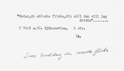 //// "Godagydu skånska flicka,din skål den vill jag //// dricka"... //// B 72:5 S.92. Sjömansvisa. 6 str. //// * //// RA. ////