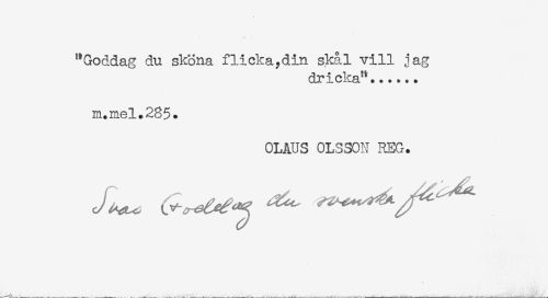 //// "Goddag du sköna flicka,din skål vill jag //// dricka"...... //// m.mel.285. //// OLAUS OLSSON REG. ////