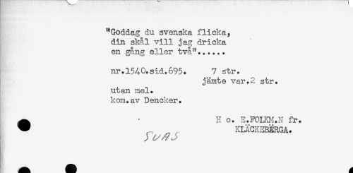//// "Goddag du svenska flicka, //// din skal vill jag dricka //// en gång eller två"...... //// * //// nr.1540.sid.695. 7 str. //// jämte var.2 str. //// utan mel. //// kom.av D encker. //// ! ^ Ho. 3.F0LKM.N fr. //// ; * ^ KLÄCK3BÄRGA. ////