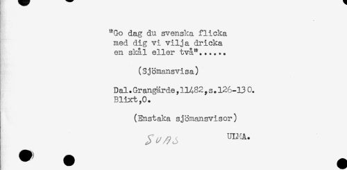 //// HR* //// "Go dag du svenska flicka //// med dig vi vilja dricka //// en skål eller två"...... //// (Sjömansvisa) //// Dal.Grangärde ?11482,s.126-13 C. //// BH3rt,0. //// (Enstaka sjömansvisor) ////