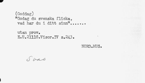 //// (Goddag) //// "Godag du svenska flicka, //// vad har du i ditt sinn"....... //// utan prov. //// E.U.2lll8.Visor.IV s.2A3. //// NORD.HUS. //// cf ////