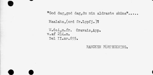 //// "God dagygod. dag,du min aldraste sköna"..... //// Haalaks,(ord fr.Lppfj.)? //// 'J. 6:4, n. f r. Oravai s ? App. //// v.af 214.m. //// Del II.nr.855. //// RAI-JCKEN FÖRTECKNING. //// * ////
