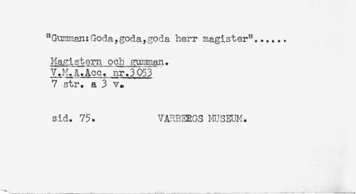 //// "Gumrfian: Goda, goda, goda herr magister"...... //// Magistern och //// V.M.å.Acc/nr.3Ö53 //// 7 str. a 3 v^ //// sid. 75. VARBERGS MUSEUM. //// . ^ ;..... ^ ^ . ... , . ////