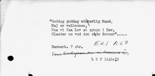 //// . ' - ..... //// "Goddag goddag miåherlig Mand, //// Maj er velkommen, \ //// Maa vi faa Lov at synge i Dav, //// - Glaeder os ved den s^de Soimner"..... //// } Danmark. 7 str. //// i ^ //// # ////
