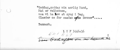 //// "Goddag,goddag min aerlig Hand, //// . Mai er velkommen, //// maa vi ha Eov at syng i Dag, //// Glaeder os for saadan Sommer"..... //// Danmark. //// L U F 3446:16 //// ^ ^ ^ ^ 4 7 t ////