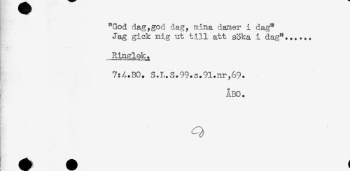 //// "God dag,god dag, mina damer i dag" //// Jag gick mig ut till att söka i dag"...... //// Ringlek. //// 7:4.BO. S.L.S.99.s.91.nr,69. //// ÅBO. //// e //// Q ////