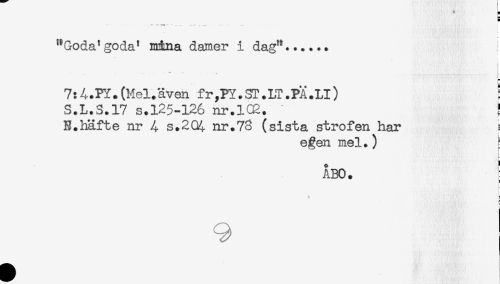 //// "Goda^godal mina damer i dag"...... //// i //// < //// t //// -* - . i //// ! //// t //// 7:A.PY.(Mel.även fr,PY.ST.LT.PÄ.H) : //// S.L.3.17 s.125-126 nr.ICS. j //// B.häfte nr A s.204 nr.73 (sista strofen har //// egen mel.) [ //// ÅBO. //// t ////