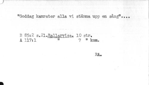 //// "Goddag kamrater alla vi stämma upp en sång".... //// t //// f //// * . ' t //// t //// ..... .....- * - - ! //// B 85:2 s.2l.Rallarvisa. 10 str. //// A 117:1 " " 7 kom. //// i //// i //// RA. //// ! //// i //// ! //// i //// i ////