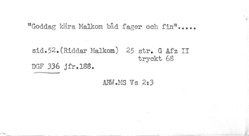 //// "Goddag kära Malkom båd fager och fin"..... //// sid.52.(Riddar Malkom) 25 str. G Afz II //// tryckt 68 //// DGF 336 jfr.188. //// ARM.MS Vs 2:3 //// ' ////
