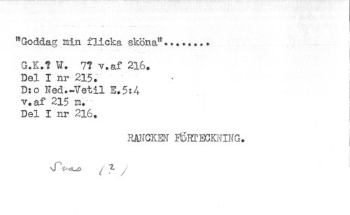//// } //// "Goddag min flicka sköna"... //// - ^ ** ... //// G.K.? W. 7? v.af 216. //// Del I nr 215. //// D:o Ned.-Vetil E.5:4 //// v.af 215 m. //// Del I nr 216. //// RANCKEN FÖRTECKNING. //// i ////