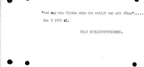 //// "God Aag min flicka skön det roligt var att råkas"., //// Se: E 1829 &I. //// KB:S SKILLINGTRYCKSREG. //// < //// //// /* ////