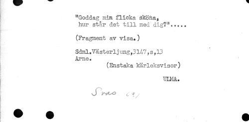 //// "Goddag misK flicka sköna, //// hur står det till med dig?"..... //// (Fragment av visa.) //// Sdml.Väst erl j ung ,314-7 ? s, 13 //// Arne. //// (Enstaka kärleksvisor) //// t ULMA. ////