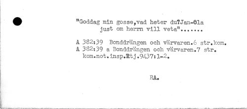 //// ^ "Goddag min gosse,vad heter du?Jan-Ola //// just om herm vill veta"....... //// å 382:39 Bonddrängen och värvaren.6 str.kom. //// å 382:39 a Bonddrängen och värvaren.7 str* //// kom. not.insp.Bt j.943 7:1-2. //// RA. ////