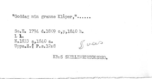 //// ] //// "Goddag min granne Klåper, //// Se.E. 1794 d.l8C9 o,p,l84.0 h. //// L 1. //// N.1833 a,l8AC a. ^ //// Upps.Z.^ P.s.l2:8 ^ //// KB: S SKILUNGTRYCKSREG. //// * ////