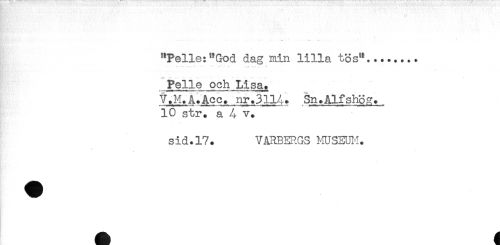 //// "Felle:"God dag min lilla tös"... //// ..... ... //// Pelle och Lisa. //// V.M.A.Acc. nr.3114. Sn.Alfshög. //// 10 str. a 4 v. //// sid. 17. VARBERGS HU3EUI1. //// * //// A å ////