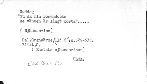 //// Goddag //// "Gu da min rosendocka //// se vännen är långt borta"..... //// ( Sjömansvisa) //// Dal.Grangärde^llA 82^s.529-530. //// Blixt,0, ^ //// ( Enstaka sjömansvisor) //// UH-iÅ. //// ^ ^ ^ é / ^ ^ //// ! //// I ////