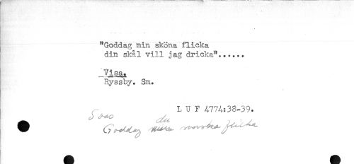 //// * //// HH*'' :. //// r "Goddag min sköna flicka //// din skål vill jag dricka"...... //// . //// . //// Visa. //// Ryssby. Sm. //// L U F A77A:38-39. ////