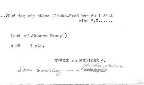 //// . JJGod dag min sköna flicka.Hvad har du i ditt //// sinn ".?...... //// (med mel.Moberg Except) //// s 88 1 str. //// DYBECK ms FOLKLORE 5. ////
