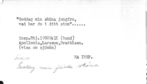 //// "Goddag min sköna jungfru, //// vad har du i ditt sinn^...... //// insp.Rtj.l9920:]X (band) //// Apollonia,Larsson,Brattåsen. //// (visa om sjömän) //// ^^ RA INSP. //// s //// ] ////