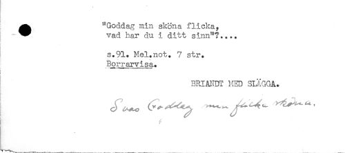 //// j //// ^ "Goddag min sköna flicka, //// - * vad har du i ditt sinn"?.... //// i //// i //// s.91. Mel.not. 7 str. //// Borrarvisa. //// ! //// i //// BRIÅNDT MEO SLAGGA. //// « ^ < ' r - * ////