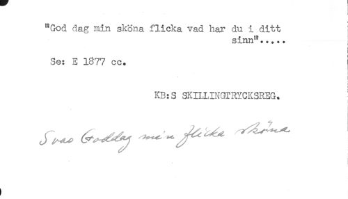 //// t //// "God dag min sköna flicka vad har du i ditt //// sinn^..... //// i //// Se: E 1877 cc. //// t //// i //// i //// KB:S SKILLINGTRYCKSREG. //// i //// - //// * //// t ////