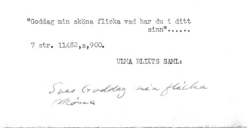 //// "Goddag min sköna flicka vad har du i ditt //// sinn"...... //// 7 str. 11482,s,900. //// UHIA BLIXTS SAML: //// - .-.-----_ --- ---- ----. - ____ ..___---__-----____-____-'-.----' ////