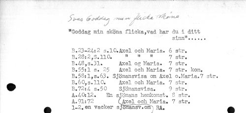 //// "Goddag min sköna flicka,vad har du i ditt //// sinn"...... //// B.23-2^:2 s.lC.Axel och Maria. 6 str. //// B.28:2,3.110. " " " 7 str. //// B.48,s.31. Axel og Maria. 7 str. //// B.55:1 s. 25 Axel och Maria. 7 str. kom. //// B.58:1,s.63. Sjömansvisa om Axel o.Maria.7 str. //// ^^ B.60,s.U0. Axel och Maria. 7 str. //// ^^ B.72:4 s.50 Sjömansvisa. 9 str. //// A.A0:12. En sjömans hemkomst. 8 str. //// A.91:72 (Axel^c^JIaria. 7 str. //// ^ 1-2. en vacker sjomansv.om) RA. ^ ////