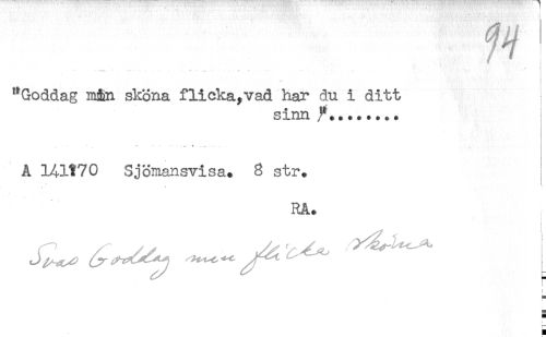 //// ^ ! //// "Goddag mån sköna flicka,vad har du i ditt //// sinn f... //// A 14H70 Sjömansvisa. 8 str. j //// RA. //// ! //// t //// t ////