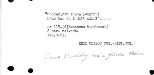 //// "Goddag,min sköna jungfru t //// Hvad har du i ditt sinn?"..... //// nr 119.(Sjömannens återkomst) //// 8 str. mel.not. //// Ekl.B.6l. //// ERIK OLSSON MUS.-HIST.HUS. ////