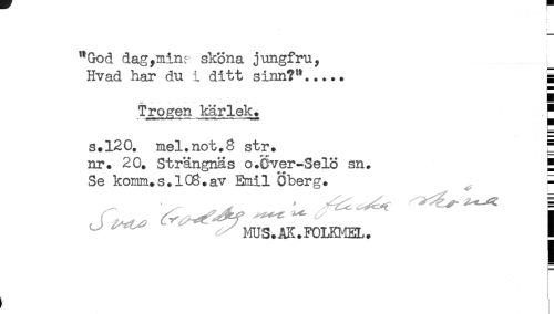 //// "God dag,mins sköna jungfru, //// Hvad har du i ditt sinn?"...., E //// Trogen kärlek* . * //// s.120. mel.not.8 str. ^ //// nr. 20. Strängnäs o.Över-Selö sn. S //// Se komm.s.ice.av Emil Oberg. = //// MUS.AK.F0LD1EL. < //// . ////