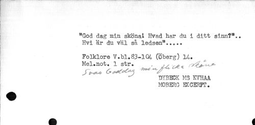 //// "God dag min skonat Hvad har du i ditt sinn?".. //// Hvi ar du väl så ledsen"..... //// Folklore V.bl.83-104 (Bberg) 14. //// Mel.not. 1 str. , //// ^ DYBECK MS WHAA //// MOBERG BXCERPT. //// ! * * ////