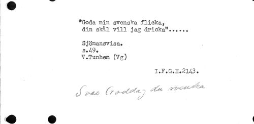 //// "Goda min svenska flicka, //// din skål vill jag dricka"...*.. //// Sjömansvisa. //// s.49. //// V.Tunhem (Vg) //// I.F.G.H.2143. ////