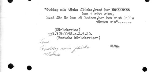 //// 6 _ //// "Goddag min täcka flicka,hvad har IBHECSBCEE //// hon i sitt sinn, //// hvad för är hon så ledsen,har hon mist lilla //// vännen sin"....... //// (Kärleksvisa) //// UPl.3Q3:1158*s.2-5.20. //// (Enstaka kärleksvisor) ////
