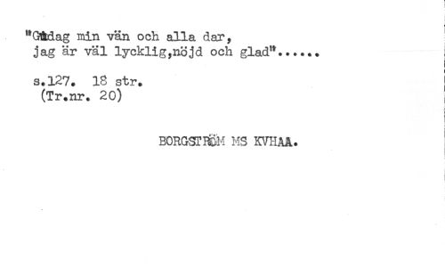 //// f //// "G&dag min vän och alla dar, //// jag är väl lycklig,nöjd och glad"...... //// s.127. 18 str. //// (Tr.nr. 20) //// .s //// ! //// i //// BORGS? nian HS KVHAÄ. //// ! ////