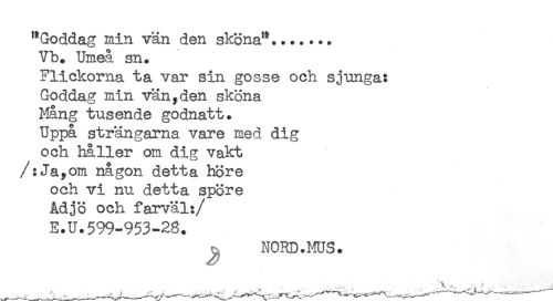 //// "Goddag min vän den sköna"....... //// Vb. Umeå sn. //// Flickorna ta var sin gosse och sjunga: //// Goddag min vän,den sköna //// Mång tusende godnatt. //// Uppå strängarna vare med dig //// och håller om dig vakt //// /:Ja,om någon detta höre //// och vi nu detta spöre //// ådjö och farväl: //// /E.U.599-953-2S. //// ^ NORD.ms. ////