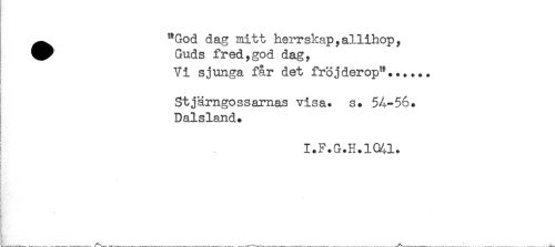 //// ^^ "God dag mitt herrskap,allihop, //// ^^ Guds fr ed, god dag, //// j Vi sjunga får det fröjderop"...... //// Stjärngossarnas visa. s. 54-56. //// Dalsland. //// ? //// I.F.G.H.1%1. //// ! //// ( //// I) //// { ////