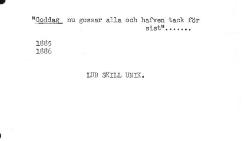 //// "Goddag_ nu gossar alla och hafven tack för //// sist"....... //// 1885 //// 1886 //// LUB SKILL miK. //// t ////