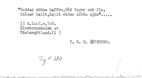 //// "Goddag sköna haffru,båd fager och fin, //// blåser kallt,kallt väder ifrån sjön"..... //// 10 d.14:2.s.7-8. //// Älvstorpsdalen av //// Västergötland.(i ) //// 1. 0. D. GOTEBORG. //// //// /