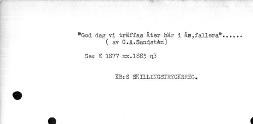 //// * //// HM?!' //// - //// ^God dag vi träffas åter här i ås,fallera"...... //// ( av C.Å.Sandstén) //// Se: E 1877 xx.1885 q3 //// KB:S SKILLINGSTRYCKSREG. ////