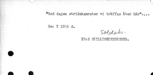 //// "God dagen stridskamrater vi träffas åter här".... //// t //// Se: Y 1866 d. //// KB:S SKILLIN3TRYCKSREG. //// - ////