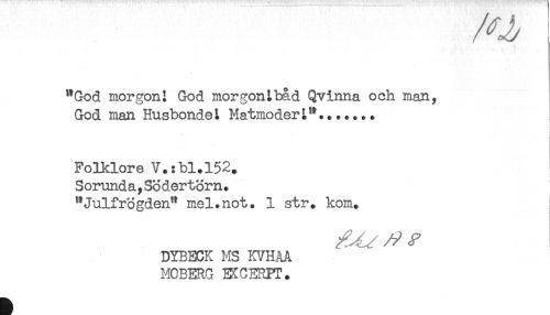 //// "God morgon! God morgontbåd Qvinna och man. //// God Dian Husbonde^ Matmodert...... //// i //// t //// Fo3XLore V.:bl.l52. //// S orund a, Sö dertörn. //// "Julfrögden" mel.not. 1 str. kom. ; //// DYBECK MS KVHAA //// MOBERG BXCERFT. ////