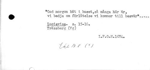//// "God morgon hät i huset,så många här är, //// ' ^^ vi bedja om förlåtelse vi kommer till besvär"....., //// * //// Luciavisa. s. 15-16. //// Trässberg (Vg) //// I.F.G.H.1074. //// i //// j //// r. __ ////