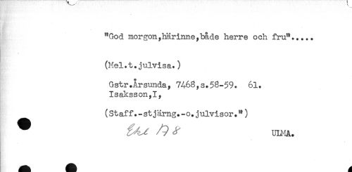 //// "God morgon,härinne,både herre och fru"..... //// (Mel.t.julvisa.) //// Gstr.Årsunda? 7468,s.58-59. 61. //// Isaksson,I, //// (Staff.-st j ärng.-o.j ulvisor.") //// ^ uu-iA. //// * ////