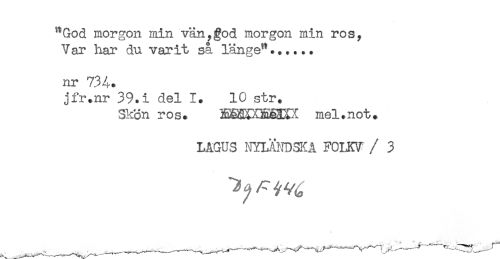 //// "God morgon min vän,god morgon min ros, //// Var har du varit så länge"...... //// nr 734. //// jfr.nr 39.i del 1. 10 str. //// Skön ros. ESg^XEéSXX mel.not. //// LAGUS NYLANDSKA FOLKV / 3 //// \ ////