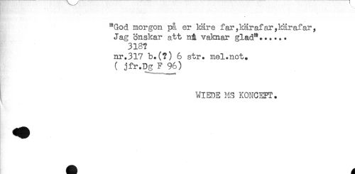 //// ' //// * //// * //// "God morgon på er käre far,kärafar,kärafar, //// Jag önskar att n& vaknar glad"...... //// 318? //// nr.317 b.(?) 6 str. mel.not. //// ( jfr.Dg F 96) //// r -'/'< //// WIEDE MS KONCEPT. //// _ //// - ////
