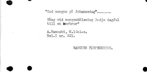 //// "God morgon på Johannedag"....... //// Sång vid morgonhälsning 3:dje dagJul //// till en horbror" //// A.Hanoski, W.10:4.-s. //// Del.I nr. 221. //// RANCKEN ^RTECKNING. ////