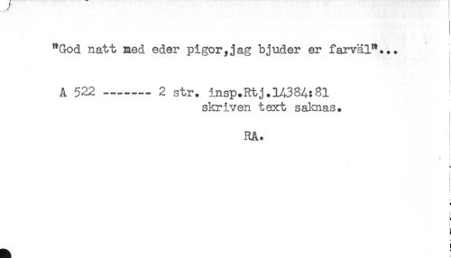 //// "God natt med eder pigor,jag bjuder er farväl"... //// Å 522 -..... 2 str. insp.Rtj.14384:81 //// skriven text salmas. //// ! //// RA. //// S f //// t //// I //// i //// < ////