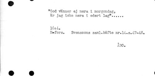 //// ^God vänner ej mera i morgondag, //// är jag icke mera i edert lag"...... //// 16:4. //// H-fors. Svenssons saml. häfte nr.14.s.47-48* //// ÅBO. ////