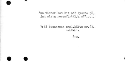//// "Go vänner kom hit och lyssna pa, //// jag sista resanförtälja må"..... //// 7:4? Svenssons saml.häfte nr.23. //// s.60-61. //// ÅBO. ////
